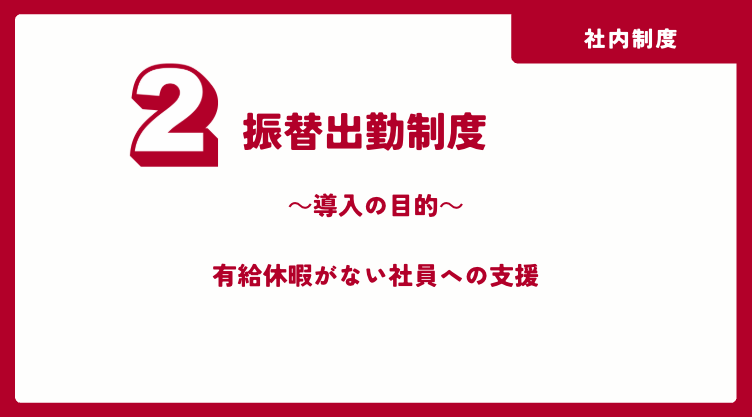 体調不良や子どもの学校行事、役所手続きなど「少しだけ時間を休みたい」──そんな時に活用できるのが振替出勤制度です。