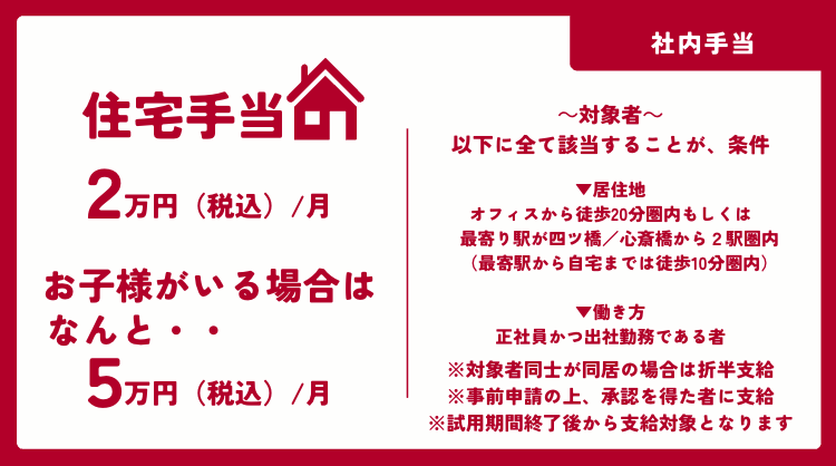 IHでは社員が安心して働けるよう、住宅手当制度を導入しています。