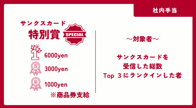 毎月、サンクスカードを最も多く受け取った上位3名を表彰し、商品券を支給しています。