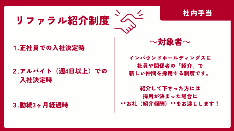 IHには、社員や関係者が知人や友人を紹介し、新しい仲間を迎え入れるためのリファラル紹介制度があります。